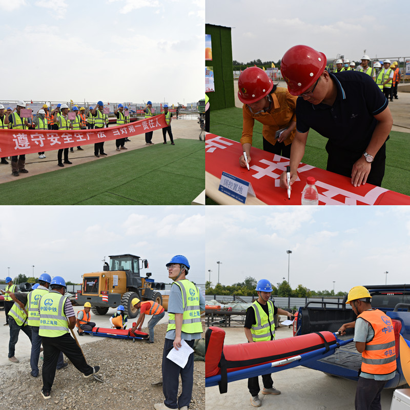本次演練共設(shè)置基坑坍塌、消防安全、防汛救災(zāi)應(yīng)急演練3個項目,按照險情發(fā)現(xiàn)和上報、險情搶救、人員救治、險情解除等環(huán)節(jié)進行,分設(shè)后勤保障組、搶險救援組、醫(yī)療救護組、警戒保衛(wèi)組、疏散引導(dǎo)組等五個專業(yè)組。下午15:00,演練拉開序幕,全體人員進行了安全宣誓,并在橫幅上鄭重簽下自己的名字。隨后,情景模擬依次展開。